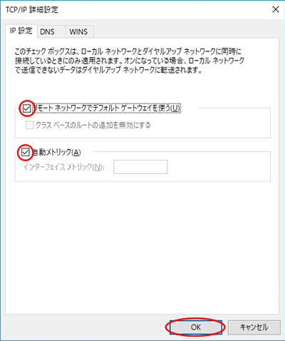 11.「リモートネットワークでデフォルトゲートウェイを使う」「自動メトリック」がそれぞれチェックONになっていることを確認します。確認したら「OK」ボタンをクリックしてください。