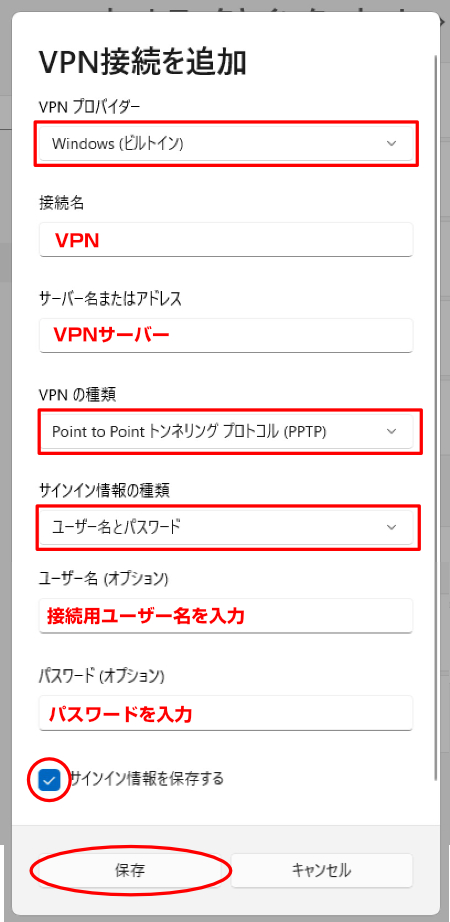 5.VPN接続を追加する画面になりますので、下記の通り入力し「保存」ボタンをクリックします。