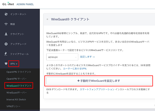 2.「手動的でWireGuardを設定する」ボタンをクリックします。