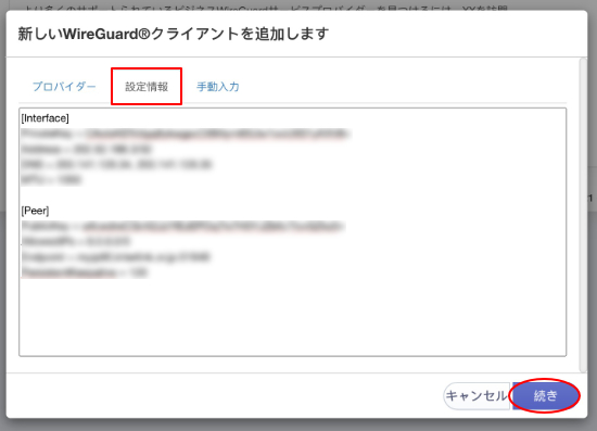5.「設定情報」よりコピーした内容を貼り付けして「続き」をクリックします。