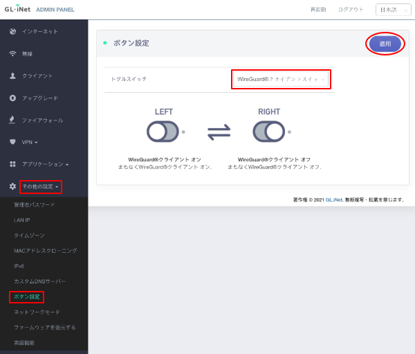 左側メニューの「その他の設定」の「ボタン設定より」、トグルスイッチを「WireGuardクライアントスイッチ」に変更して「適用」をクリックします。