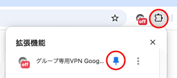 2.拡張機能のアイコンをクリックして、グループ専用VPNの横にあるピンマークをONにします。