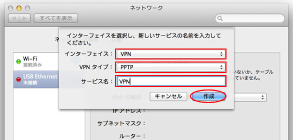 3.インターフェース、VPNタイプ、サービス名が追加できる画面が表示されます。それぞれ下記のように入力して「作成」ボタンをクリックします。