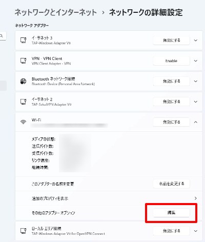 ※有線LANでインターネット接続している場合は、イーサネットの「その他のアダプターオプションの編集」をクリックします。
