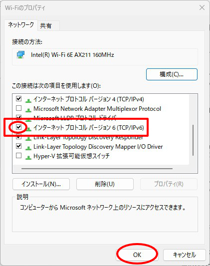 5.「インターネットプロトコルバージョン6(TCP/IPv6)」にチェックが入っているか確認します。
