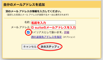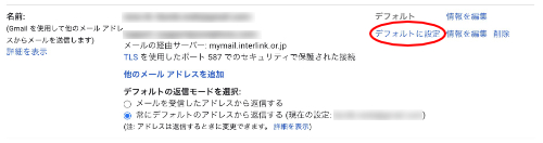 7.追加したメールアドレスをで「デフォルトに設定します。」※この設定により常にG suiteで利用していたメールアドレスを差出人(From)として送信します。