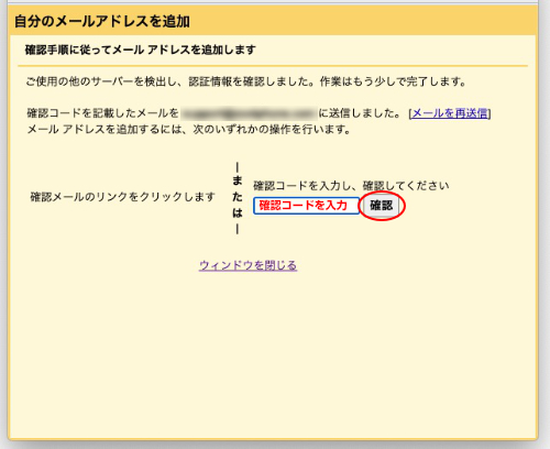 6.確認コードが送信されますので、入力して「確認」ボタンをクリックします。