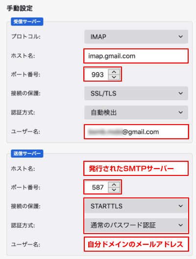 以下はThunderbirdのメール設定例です。