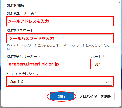 5.次の表を参照にメールアカウントの設定情報を入力し、「続行」をクリックします。