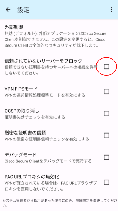 5.「設定」画面になりますので、「信頼されていないサーバをブロック」のチェックをOFFにします。