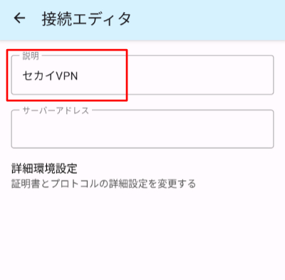 7.説明をタップし、任意の名前を入力します。例)セカイVPN