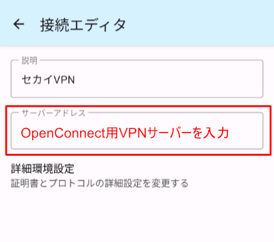 8.サーバーアドレスをタップしOpenConnect用のサーバーのIPアドレスを入力します。