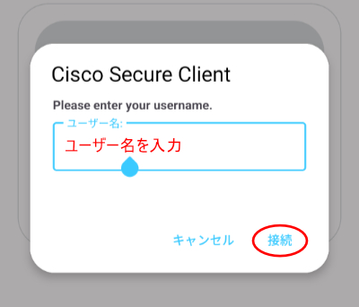 12.以下の画面でユーザー名を入力して、「接続」をタップします。