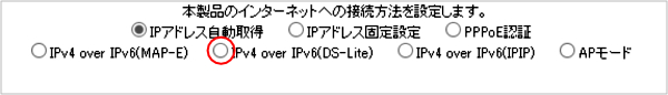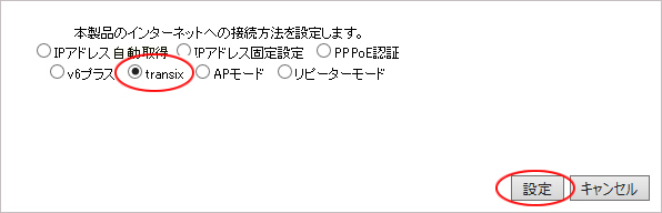 5.以下の通り動作モードが「transix」または「IPv4 over IPv6(DS-Lite)」になっているか確認します。チェックが入っていない場合は、チェックを入れて「設定」ボタンをクリックしてください。