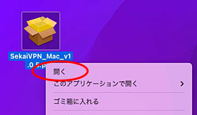 2.ダウンロードしたインストーラーを右クリック(またはControl+左クリック)して「開く」をクリックします。