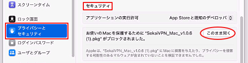 macOS 15 Sequoia以降を利用している場合は、[システム設定]→[プライバシーとセキュリティ]と進み、[セキュリティ]の項目から「このまま開く」をクリックしてください。