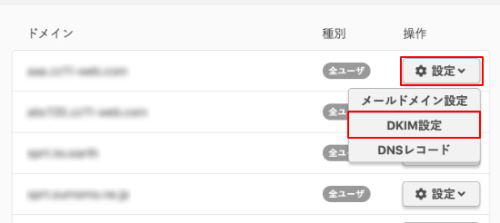 サーバーに登録されているドメイン名が表示されますので、DKIM署名を行いたいドメインの『設定』をクリックし、『DKIM設定』をクリックします。
