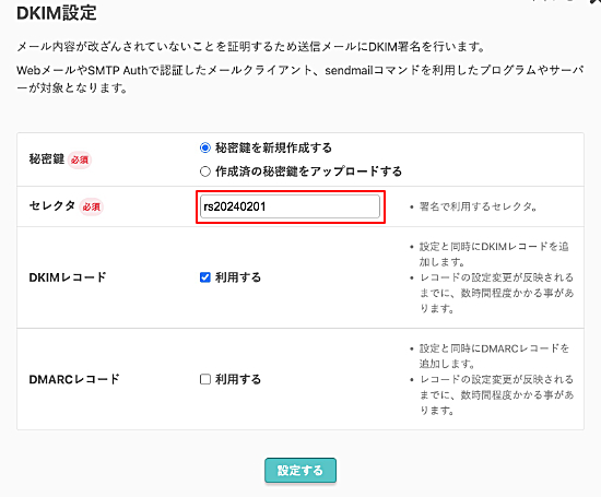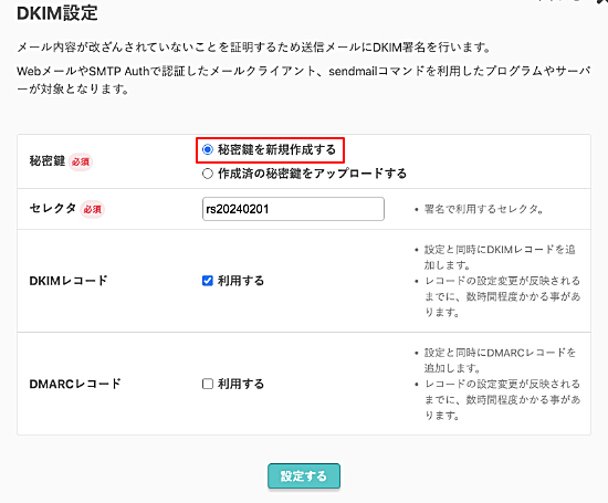 DKIM署名に必要な秘密鍵を作成するか、お手持ちの秘密鍵の登録を行います。