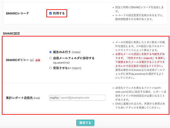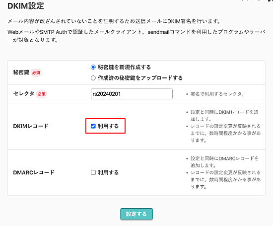 DKIMの設定と同時にDMARC設定を行う場合は、『利用する』にチェックを入れてください。