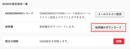 4.DKIM設定画面で、『秘密鍵のダウンロード』ボタンをクリックします。