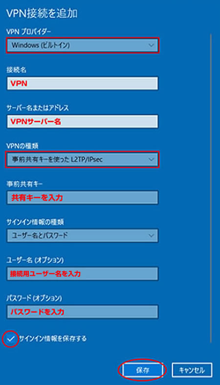 4.VPN接続を追加する画面になりますので、下記の通り入力し「保存」ボタンをクリックします。