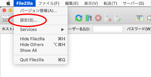画面左上の『 FileZilla 』の『 設定 』をクリックします。