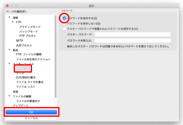 3.[インターフェース]欄の『 パスワード 』をクリックし、[パスワードを保存する]を選択します。