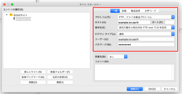 FTP サーバ名(S):example.isv.earth(初期ドメイン)