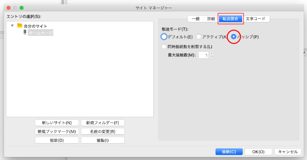 8.次に[転送設定]タブをクリックし、転送モードを『 パッシブ 』を選択します。画面下部の『 OK 』をクリックします。