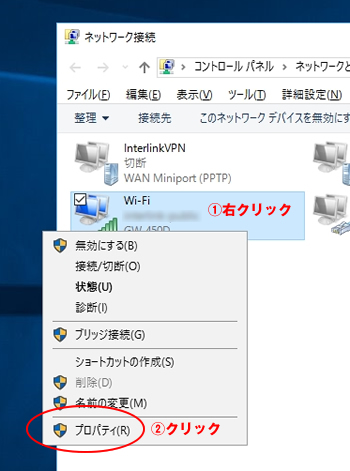 4.インターネット接続のアイコンを右クリックして、プロパティをクリックします。(添付はWi-Fiでインターネット接続している状態です)