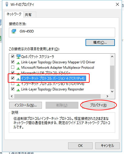 5.「インターネットプロトコルバージョン4(TCP/IPv4)を選択して「プロパティ」をクリックします。