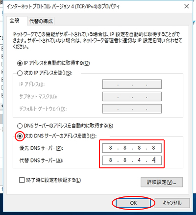6.「次のDNSサーバーのアドレスを使う」にチェックを入れて優先DNSサーバーに8.8.8.8、代替DNSサーバーに8.8.4.4を入力して「OK」をクリックします。