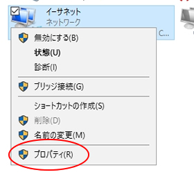 ※有線LANでインターネット接続している場合は、イーサネットのアイコンのプロパティをクリックします。