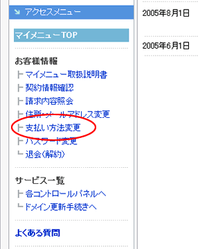 メニューの「支払い方法変更」をクリックしてください。 |