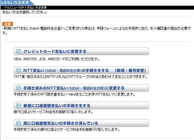 クレジットカード支払い、NTT支払い(tabalまるごと決済・電話料金合算)、口座振替への変更申請は、「マイメニュー」に