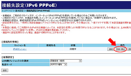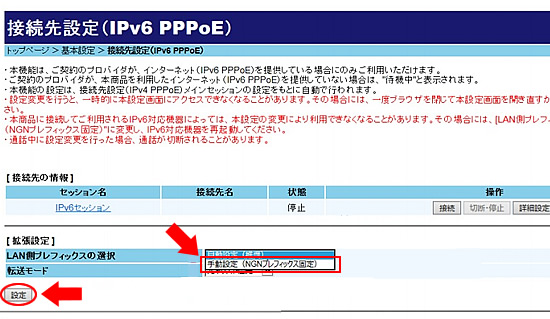 ホームゲートウェイにログイン後、IPv6セッションを停止し、LAN側プレフィックスの選択を「手動設定(NGNプレフィックス固定)」に変更してください。