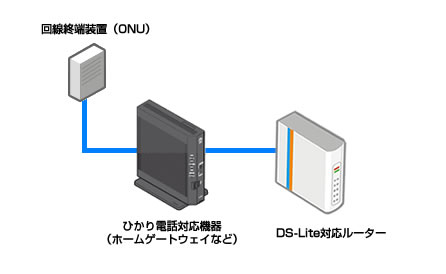 以下のように、HUBは利用せず、ひかり電話対応機器(ホームゲートウェイなど)の下にDS-Lite対応ルーターを繋いでください。
