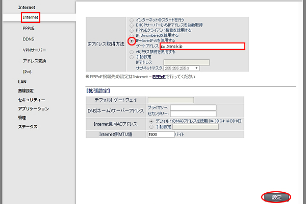 5.左メニューにある「Internet」から「Internet」をクリックし、「IPアドレス取得方法」を「※IPv4 over IPv6を使用する」にチェックを入れ、ゲートアドレスに「gw.transix.jp」を入力します。