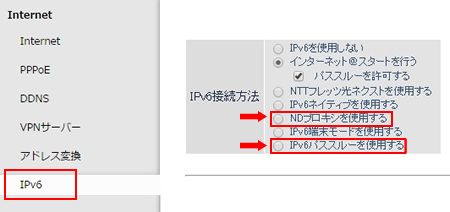 接続ができない場合は、IPv6の設定を開き、「NDプロキシ」もしくは「IPv6パススルー」にチェックを入れ設定を保存後、通信できるかお試しください。