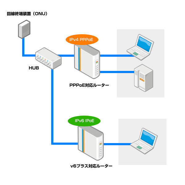 | 構成例1)ONUからHUBで分岐してルーターを並列に配置する |
