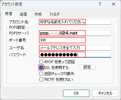.アカウント設定の受信画面が表示されますので、以下のように設定します
