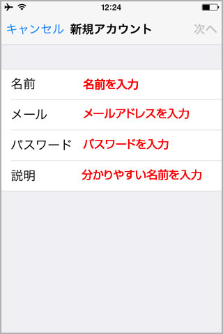 6.新規アカウントの画面が表示されます。それぞれ下記のように入力して、右上の「次へ」をタップします。