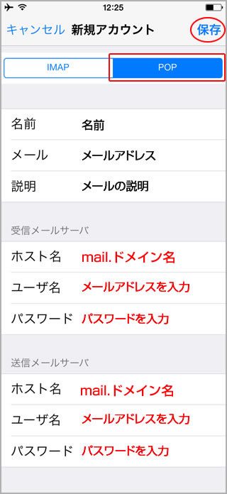 7.POPを選択し、各設定項目を下記のように入力して、画面右上の「保存」をタップします。