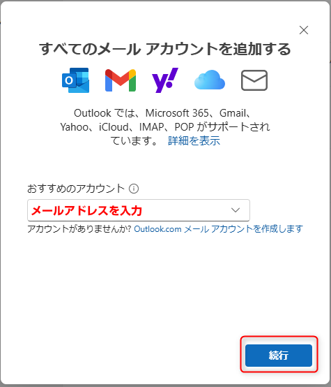 5.次の表を参照にメールアカウントの設定情報を入力し、「続行」をクリックします。