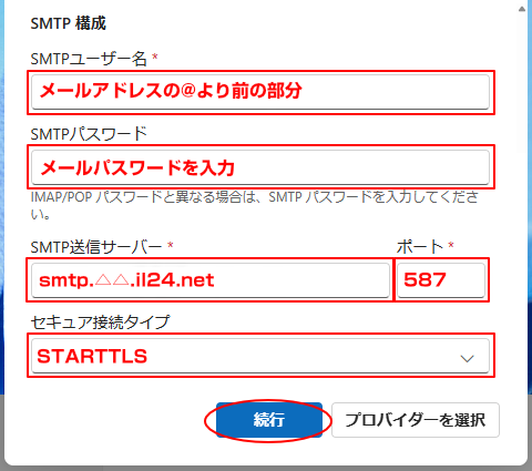 メールアドレスの@より前の部分 ※○○○@△△.il24.net の「○○○」部分です。 |