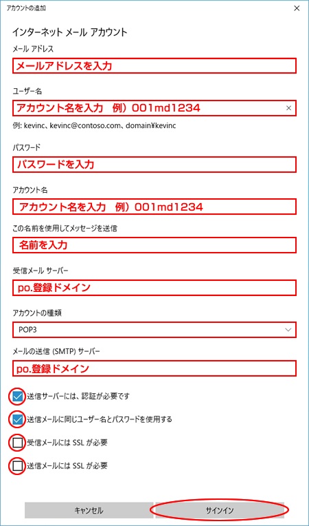 メールの送信(SMTP)サーバー po.登録ドメイン名