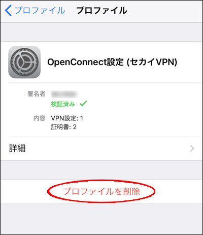 1.ホーム画面の「設定」をタップし、一般>VPNとデバイス管理>OpenConnect設定(セカイVPN)>プロファイルを削除をタップします。