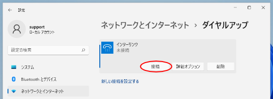 7.ユーザー名(例:xxxx@xx.il24.net)とパスワードを入力し、接続名(例:インターリンク)を入力して「接続」ボタンをクリックします。