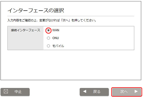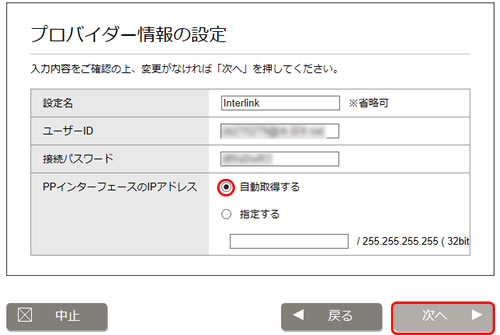 5.「プロバイダー情報の設定」に接続用ユーザーIDとパスワードを設定し、PPインターフェースのIPアドレス自動取得を選択し「次へ」をクリック。(設定名は任意で入力)