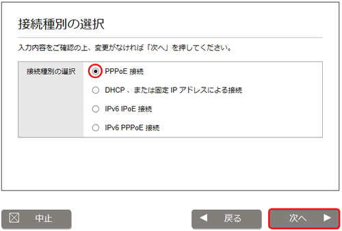 4.PPPoE接続を選択し「次へ」をクリックします。